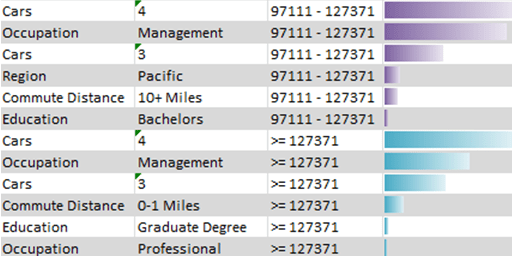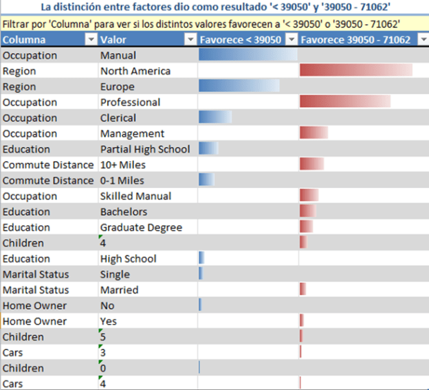 Si la columna de destino contiene valores numéricos continuos, la herramienta segmenta automáticamente los valores numéricos en grupos. Estas agrupaciones representan clústeres de casos que tienen características similares. Sin embargo, los valores numéricos podrían no estar divididos en grupos fáciles de usar. Veamos el resultado que se obtiene tras analizar estos valores. Como vemos, los valores numéricos podrían no estar divididos en grupos fáciles de usar.