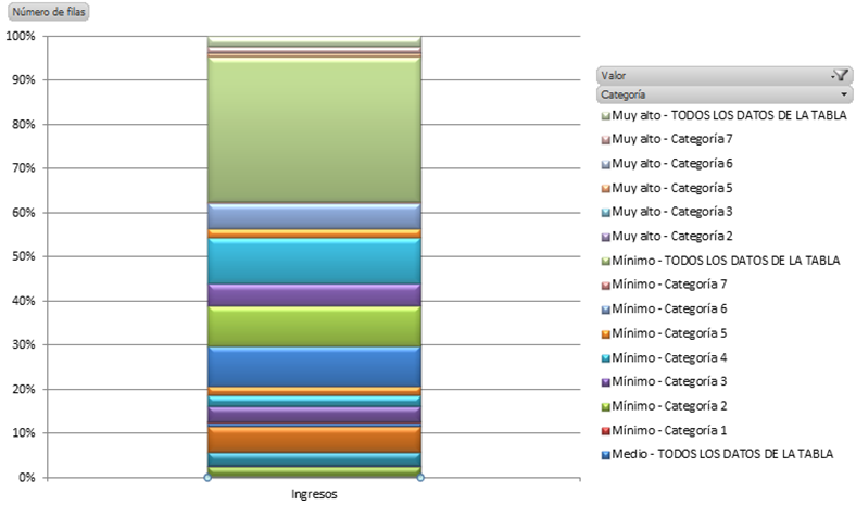 Los elementos de esta tabla dinámica se pueden combinar de formas diversas en los campos de eje (categorías) y de leyenda (series). En el primer caso estamos combinando Valor y Categoría en el eje leyenda, obteniendo el siguiente resultado.