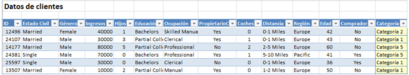 Para finalizar el análisis de esta herramienta que sirve para Detectar categorías, veamos cómo se ha modificado la tabla que contiene los datos originales, como vemos se ha agregado una columna con el nombre de cada categoría.