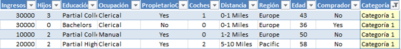 Vamos a filtrar los datos de la columna en la Categoría1, en efecto vemos que los ingresos son bajos y la región es Europe, tal y como vimos en la segunda tabla.