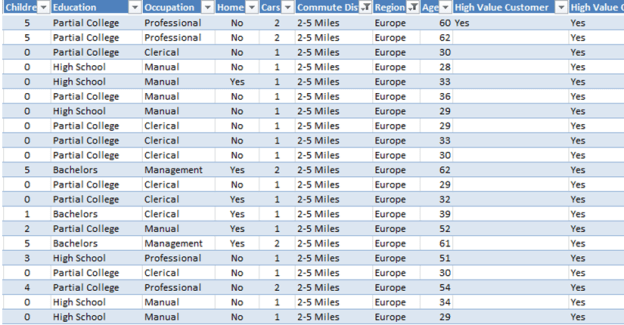 Vamos a detenernos un poco en los resultados, hemos dicho antes que el valor 2-5 Miles de la columna Commute Distance predice a un cliente como valioso en un 34%. ¿Qué pasaría si filtramos nuestra tabla de datos por este valor? Veamos: