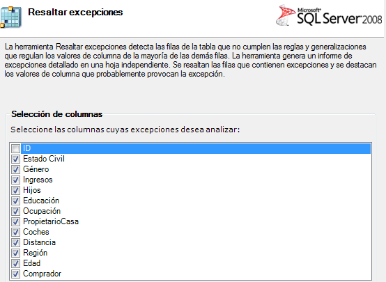 En nuestro primer ejemplo, hemos seleccionado casi todas las columnas indicando que sobre todas las marcadas deseamos buscar excepciones y crear un patrón general, por otra parte anulamos la selección de la columna ID, ya que no contribuye al análisis.