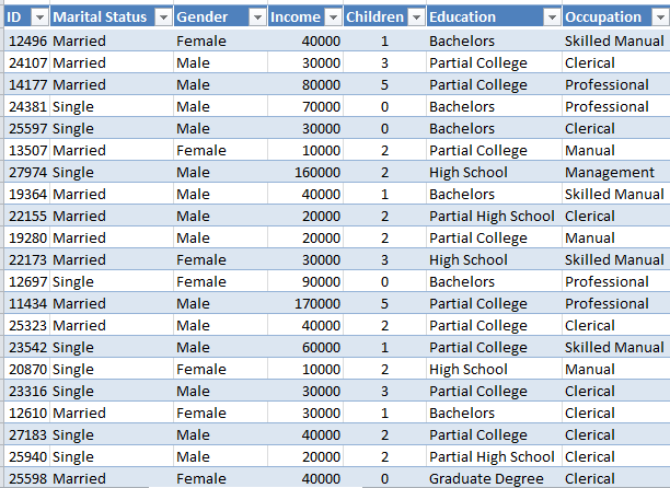 Vamos a recordar los datos con los que venimos trabajando en esta serie. Se trata de los ejemplos que podemos descargar con el Add-ins de Minería de Datos para Excel. Un subconjunto de estos datos los podemos ver en la siguiente imagen