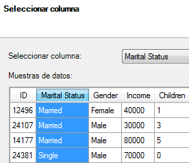 Para ello, vamos a la opción de Menú – Minería de Datos, concretamente al grupo Preparación de datos y más concretamente al botón Explorar Datos y llamamos al Asistente Explorar datos. Lo primero será seleccionar los datos de origen, sólo se admiten tablas o intervalos de datos de tablas Excel, nada de datos externos por ahora. Seleccionamos toda la tabla y luego podemos ir analizando columna a columna. Vamos a empezar por Estado Civil o lo que es lo mismo Marital Status.