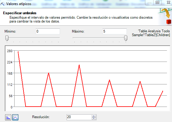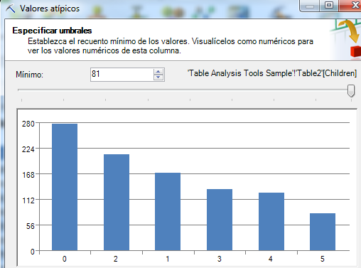 De igual forma, el asistente muestra los valores continuos en un gráfico de barras o en un gráfico de líneas. Voy a regresar al ejemplo de los hijos (columna Children). Veamos que los valores están debidamente organizados de mayor a menor y que solamente admite modificar el rango mínimo.