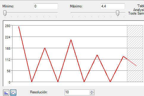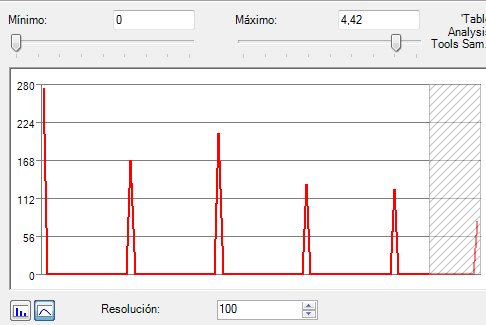 La resolución se mueve en rangos de 10 a 100, siendo 20 el predeterminado y lo que nos permite es determinar el umbral con mayor o menor grado de exactitud. Veamos el aspecto que tiene visualizar los datos empleando la máxima y mínima resolución.