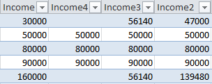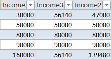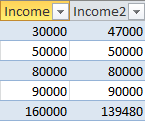 En el segundo caso, Cambiar valor a promedio, el valor para sustituir es siempre el mismo, lo que queremos es reemplazar todos los valores atípicos por un único valor, el promedio. El resultado se observa en la columna Income3.