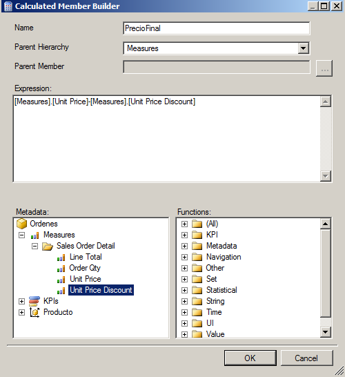 Para ello, contamos con una ventana Calculate member Builder que dispone de la información de los metadatos y las funciones MDX, así como el resto de propiedades que hay que configurar para crear miembros calculados con SSAS Multidimensional.
