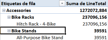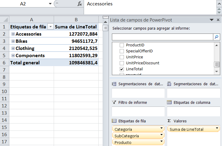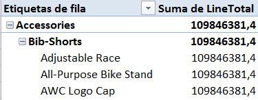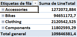 Hacemos una prueba,intentaremos mostrar un dato de SalesOrderDetails, por ejemplo, LineTotal y describirlo a través de Categorías, Subcategorías y Productos, veamos.