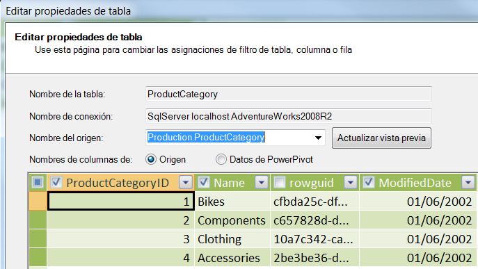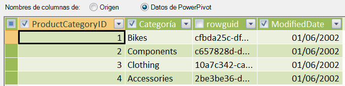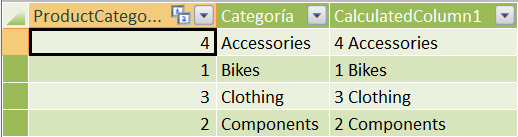 Vamos a analizar una tabla sencilla, la más sencilla que tenemos, Production.ProductCategory, sobre la que ya hemos realizado modificaciones. Uno de los cambios consistió en agregar una columna que simplemente concatenaba dos columnas existentes, nada especial, un sencillo cálculo, suficiente para demostrar la funcionalidad. Otro cambio ha sido que una de las columnas tiene el nombre modificado, en la versión original es Name y en la ventana PowerPivot es Categoría.
