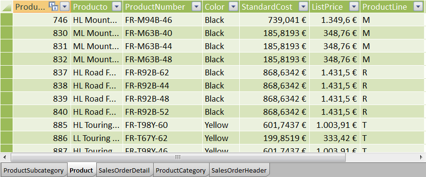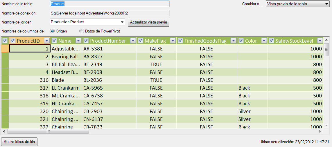 Veamos que en esta tabla se recuperó el nombre de la columna Name, tal y como aparece en el original. Podemos obtener una vista en la que aparezcan los nombres de columnas según la ventana PowerPivot y desde esta vista se pueden realizar las mismas acciones que antes.