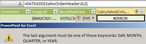 Suponiendo que no hayamos visto la ayuda y que no conozcamos los tipos y valores que están definidos para los parámetros, podemos crear situaciones de error que son perfectamente reportadas por PowerPivot al estilo MS Office Excel, como se muestra en la ventana