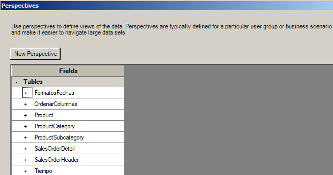 Los que hemos trabajado el modelo multidimensional de SSAS estamos familiarizados con el concepto de perspectivas. Para este modelo tabular que se crea con PowerPivot van a cumplir el mismo propósito y se van a crear igual de fácil. Una perspectiva es un subconjunto de elementos del modelo (podemos llamarles metadatos) que se seleccionan para ser mostrados a un cliente final determinado. El objetivo al crear una perspectiva es despejarle el panorama al usuario y mostrar solamente aquellos elementos que necesita.