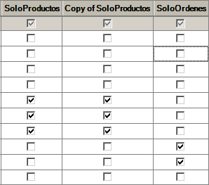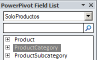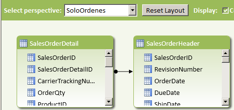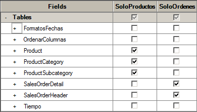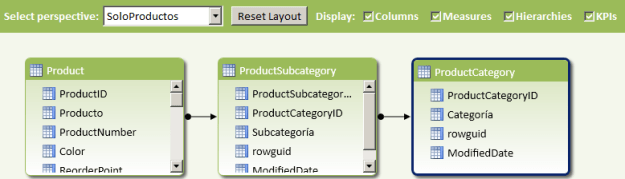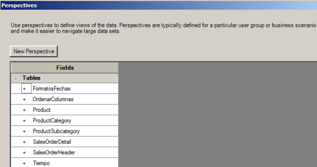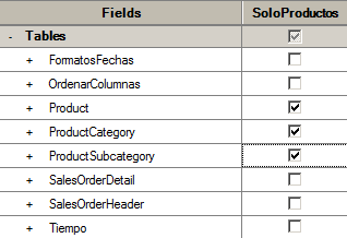 El botón New Perspective activa una columna con casillas de verificación para que seleccionemos los elementos adecuados, digamos que sólo queremos ver las columnas relacionadas con productos, seleccionamos las 3 tablas como se muestra a continuación
