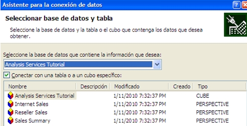 Antes de terminar quiero comentarles un cambio de comportamiento en cuanto a perspectivas entre SSAS y PowerPivot. Cuando estamos estableciendo una conexión aun origen de datos SSAS para crear una tabla dinámica con MS Office Excel, podemos escoger entre el cubo o una de las perspectivas que tenga creadas, como vimos aquí