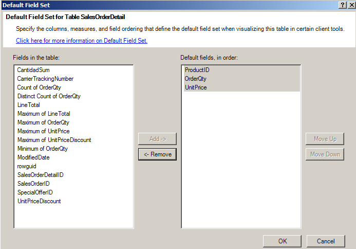 El significado de esta acción es que cuando en Power View seleccionemos esta tabla las columnas que se verán serán estas, por lo que se nos presentará una tabla con 3 columnas con la conexión de cada columna asociada a ProductID, OrderQty y UnitPrice respectivamente. Esto es muy beneficioso. Esta configuración no surte efecto en la herramienta cliente Tabla dinámica de MS Office Excel.