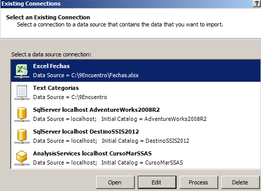En nuestro caso tenemos una conexión a MS Excel, una a Texto y 3 a Bases de datos, una de ellas, multidimensional.