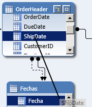 Como vimos antes en PowerPivot para SQL Server 2012, ya podemos establecer múltiples relaciones enlazando una y otra vez la columna Fecha con las columnas de la tabla OrderHeader que contienen datos relativos a las fechas.