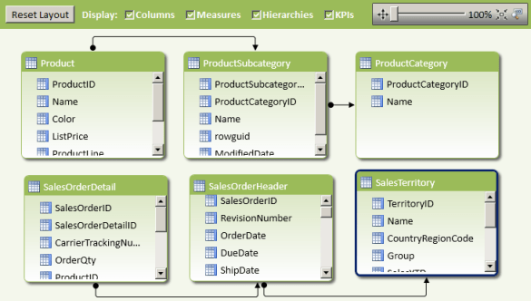 Una vez importados este es el aspecto en la ventana PowerPivot.