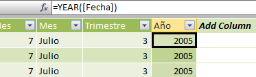 La columna ha tomado un nombre, CalculatedColumn1, que no nos va a valer en el futuro así es que lo cambiamos. Para ello basta con colocarse en la cabecera de la columna y con doble clic se activa el texto permitiendo cualquier modificación. La cambiamos por Año.