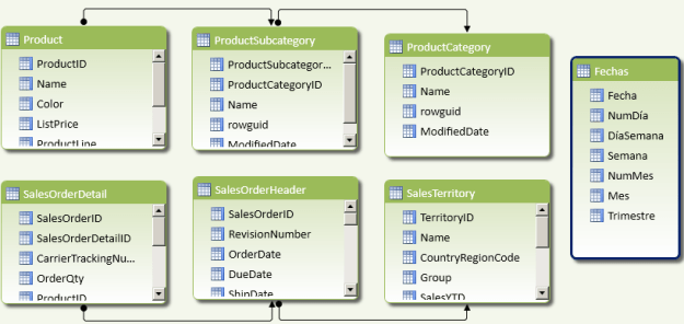 Vamos a recordar el entorno de datos que habíamos creado que es sobre el que vamos a trabajar, tenemos 7 tablas, 6 de ellas procedentes de la Base de datos AdventureWorks 2012 y una que hemos agregado desde un fichero Excel. Las tablas tienen algunas relaciones entre ellas y estaremos viendo cómo afectan las relaciones que no están creadas y cómo crearlas.