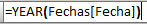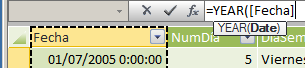 En la expresión de hoy hemos utilizado el operador igual (=), la función YEAR de tipo Fecha y Hora y la columna Fecha de la propia tabla Fechas. Como resultado tenemos un número entero de 4 cifras que representa el año de la fecha seleccionada.