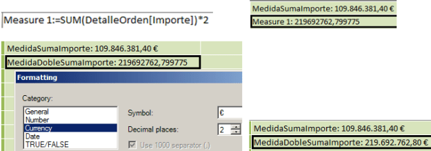 Si estamos situados en cualquier celda vacía del panel medidas se activa el cuadro de expresiones, desde el que podemos acometer las acciones que vimos antes cuando tratamos las columnas calculadas. En este caso, vamos a obtener el doble del mismo cálculo realizado anteriormente.