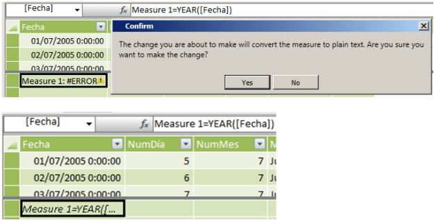En este caso, nos devuelve error, que dice que o la columna Fecha no existe o no existe una fila actual para esa columna, es decir, no es posible detectar el contexto de fila.