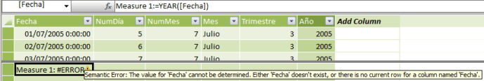 Si, por otra parte, intentamos crear una medida con el mismo contenido que la fórmula, no podremos, porque no encuentra el contexto de fila que necesita, para ello tendríamos que aplicar otras condiciones. Veamos un ejemplo a partir del cálculo del Año, tal y como hicimos antes. Desde una celda del panel de valores escribimos la misma fórmula, que sabemos que es correcta.