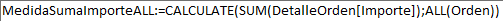Esta es la expresión: MedidaSumaImporteALL:=CALCULATE(SUM(DetalleOrden[Importe]);ALL(Orden))