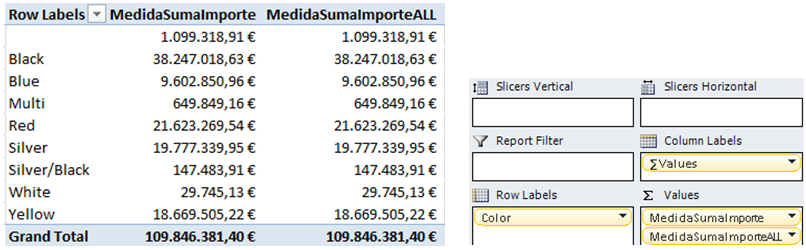 Aplicamos filtro sobre las etiquetas, por ejemplo de filas. En este caso, volvemos a obtener el mismo resultado para las dos columnas. El contexto de consulta a aplicado un filtro a una columna de la tabla Producto que no está afectado por el filtro All.