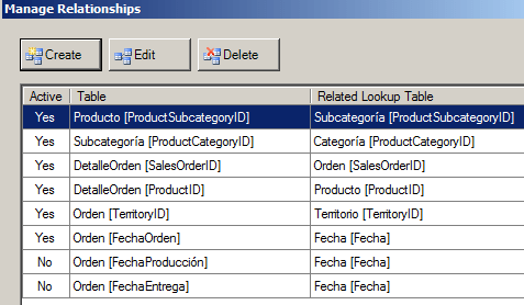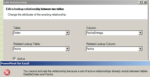 Para demostrarlo, vamos a cambiar la relación activa. Vamos a seleccionar la relación entre Fecha.Fecha y Orden.FechaEntrega como relación activa. Desde la ventana Excel no podemos modificar el modelo en este sentido, así es que regresamos a la ventana PowerPivot.
