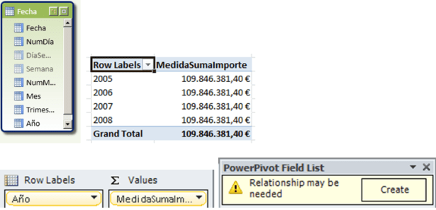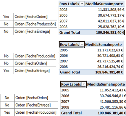 En todos los casos, en los paneles de la tabla dinámica la selección que tenemos es la misma. En todos los casos está bien, porque en efecto se han establecido las relaciones y en todos los casos los valores son diferentes. Otro problema que tenemos es que desde esta tabla dinámica no tenemos ninguna información acerca de la relación activa, por lo que no tenemos claro, por cuál de las tres fechas se están mostrando los datos.
