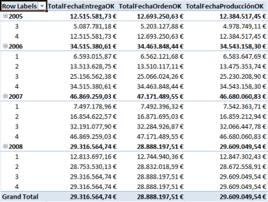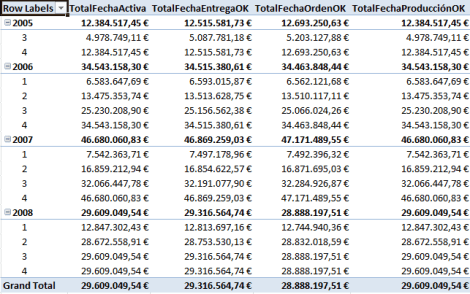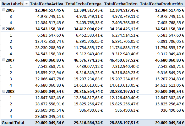 Si nos vamos al análisis por trimestres, vemos un extraño comportamiento de la función TOTALYTD(), sabemos que esta función lo que va creando es el Total Acumulado hasta la fecha, si la fecha corresponde a un año pasado, pues al finalizar el año es el mismo dato que la suma. Como vemos, sólo es correcto para la medida que utiliza la columna Fecha, el resto en lugar de acumular, muestra el dato de la suma para cada período, sin acumular. Ni siquiera nos ha funcionado bien para la FechaProducción, que es la columna que tiene la relación activa con Fecha.