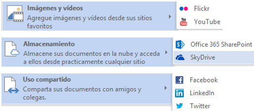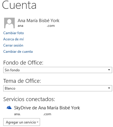 El fondo y el tema de Office ofrecen algunas opciones para configurar según nuestro deseo y luego tenemos algo muy importante que son los servicios conectados a nuestra cuenta MS Office. En mi caso, como muestra la imagen, tengo un servicio Skydrive conectado. Sobre Skydrive puedo aconsejarles este enlace y comentarles que viene siendo nuestra nube personal, con capacidad para 7 GB de almacenamiento gratuito, accesible desde cualquier lugar y dispositivo.
