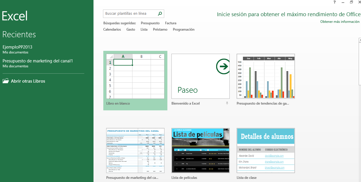 Al seleccionar Excel nos encontramos con el llamado Inicio rápido que nos ofrece, por una parte en el panel de la izquierda los archivos recientes y por otro, un conjunto de plantillas preparadas para ilustrarnos ejemplos de uso de MS Office Excel en diversos sectores del mundo real, las plantillas, aunque no son novedad de esta versión sí que están mejor presentadas y vienen prediseñadas y configuradas de tal forma que si se ajustan a nuestras necesidades, podemos centrarnos en los datos.