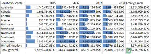 Barras de datos, mientras mayor es el número, mayor la barra, sencillo. Este es un ejemplo donde se ve que los Totales, ni por filas ni por columnas están incluidos.