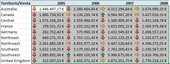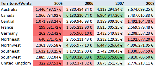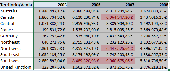 10% de Valores. Aquellas celdas en las que el valor esté en el rango del 10% superior. Si comparamos con la opción anterior, vemos que la condición es más restrictiva y muestra menos celdas.