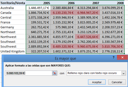 Mayores que. Los valores mayores que el número indicado se resaltan. El número se propone por parte de Excel 2013 y lo podemos ajustar en la ventana que aparece cuando seleccionamos esta opción.