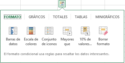 Antes de entrar en el análisis de las novedades en tablas, tablas dinámicas y gráficos en Office Excel 2013, me parece útil que veamos el reflejo que tienen estas opciones de Análisis rápido sobre el formato condicional de los datos.