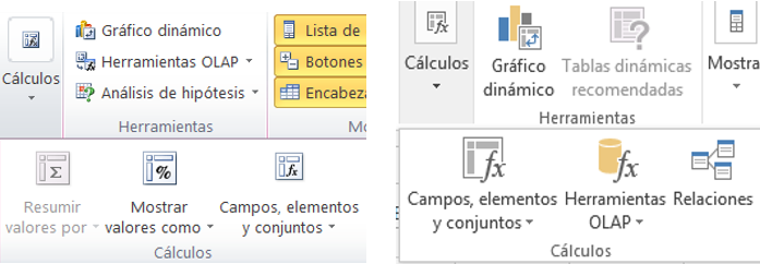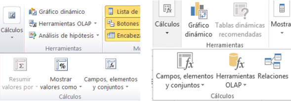 Nos encontramos varios elementos, por ejemplo en el grupo Campo activo tenemos: Explorar en profundidad y Rastrear agrupando datos, que no he probado; pero supongo que tiene que ver con Tablas dinámicas desde cubos OLAP. Vemos además un nuevo grupo Filtrar, en el que se agrupan los filtros por Segmentación de datos y por Escala de tiempo, que es una novedad de la presente versión, la que veremos en funcionamiento en los próximos días.