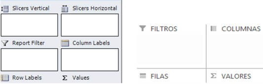 Y un pequeño cambio lo encontramos en los paneles de la lista de campos de tabla dinámica, ya que desaparecen los paneles para segmentadores y mejoran los nombres del resto de paneles.