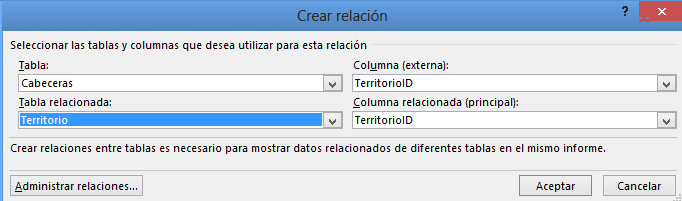 Creamos una relación entre las tablas Cabecera y Territorio.