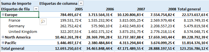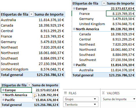 Sólo nos queda seleccionar el campo que deseemos de la ficha Todos, agregarlo al panel Filas o Columnas y obtener el informe que deseamos, por ejemplo: Agregados (suma) de importes de las ventas por Grupos de Territorios y Territorios desglosados por Año, según la fecha de orden (campo Ordenado).