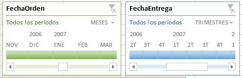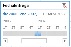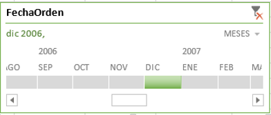 Podemos seleccionar uno o más campos, como en el caso de segmentadores y el resultado será un nuevo elemento del libro Excel, como en segmentadores y una nueva opción de menú para definir el formato para este tipo de filtro. He aquí el aspecto en versión predeterminada de un filtro de Escala de tiempos.