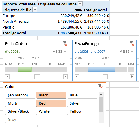 Y aquí tenemos un ejemplo del resultado de aplicar varios filtros, de distintos tipos sobre la tabla dinámica, aprovechando las Novedades de MS Office Excel 2013.