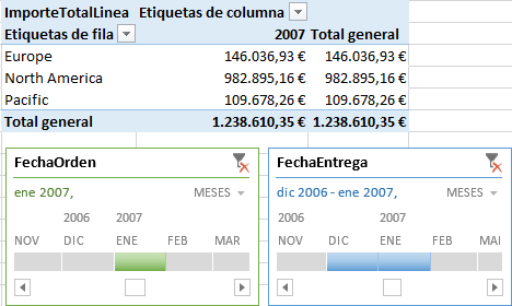 Agregamos dos filtros de línea de tiempo, por las columnas FechaOrden y FechaEntrega de la tabla Cabecera.