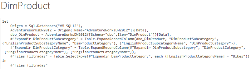 #"Filas filtradas" = Table.SelectRows(#"Expandir DimProductCategory", each ([EnglishProductCategoryName] = "Bikes"))