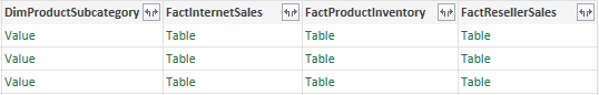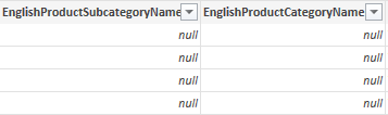 Desplazamos la barra hasta encontrar la columna DimProductSubcategory, que se corresponde con las subcategorías.