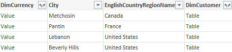 De esta forma, la tabla que estamos importando FactInternetSales, que se corresponde con las ventas, trae dos columnas descriptivas para países y ciudades.